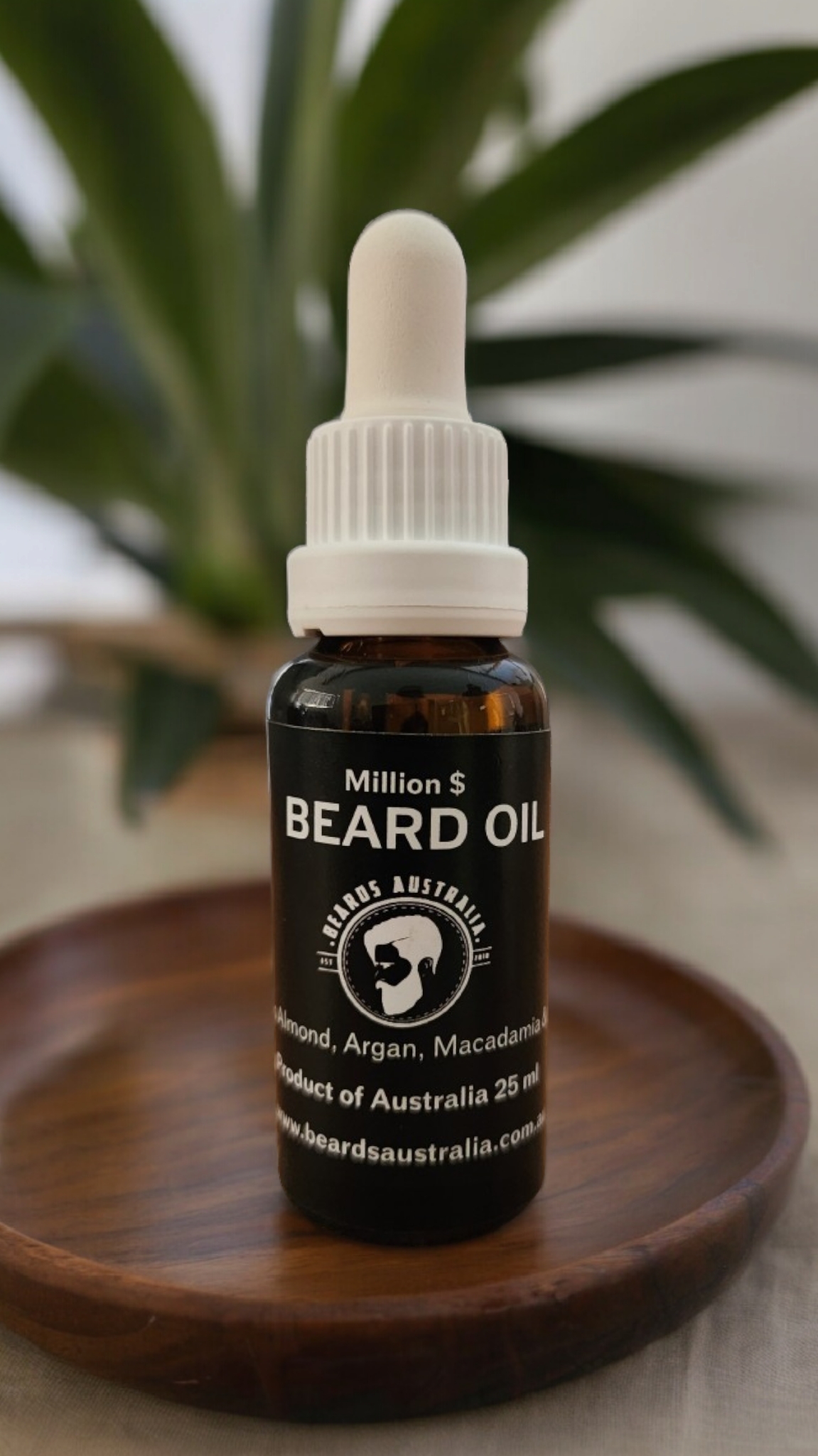 Natural Beard Oil Fragrance Million $, in a 25 ml bottle. This lightweight Beard Oil will help soften and nourish the follicles on the skin & beard. Our beard oil is hand-poured in Australia and packed full of natural ingredients containing Almond, Argan, Macadamia & Jojoba oils. Here at Beards Australia, we pride ourselves on using the best natural oils available to moisturize & help keep your facial hair healthy. The fragrance is Million $, very classy, and our most popular seller.